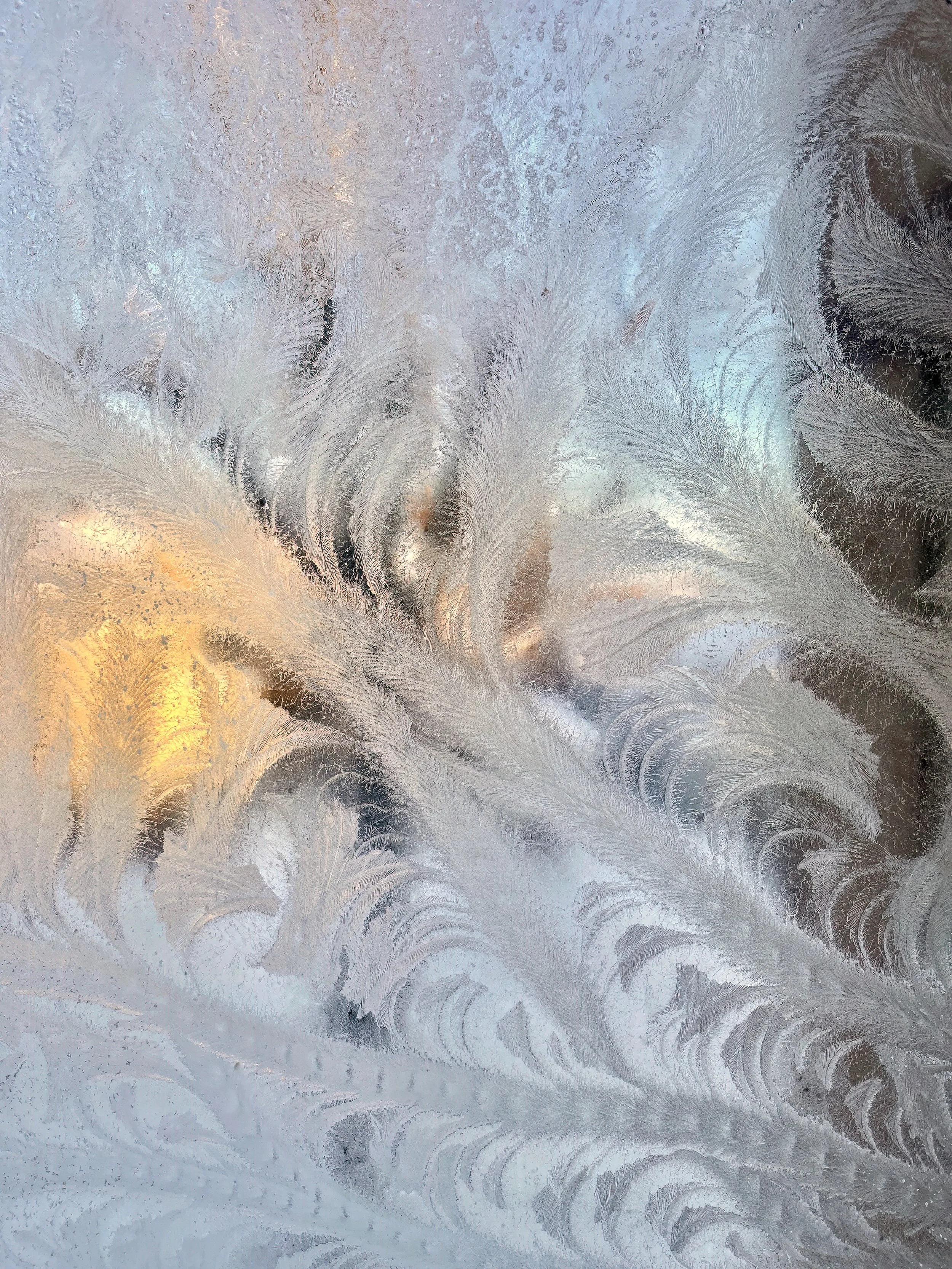 Despite being a decades long transplant, I’ve never quite warmed up to our lengthy and harsh Minnesota winters, though my earth-loving nature deeply appreciates the season’s beauty and quiet purpose. The one aspect of winter I look forward to is the magical frost that covers my apartment windows during especially frigid stretches, often leaving heart or creature shapes, blocking the outside world with thick, intricate frosty “feathers” through which I view sunrise or sunset in an enchanted, abstractly distorted way. Intricate icicles, delicate hoarfrost, thickly frozen lakes and embedded but still vivid leftover leaves have been instruments of fascination for this native Texan.