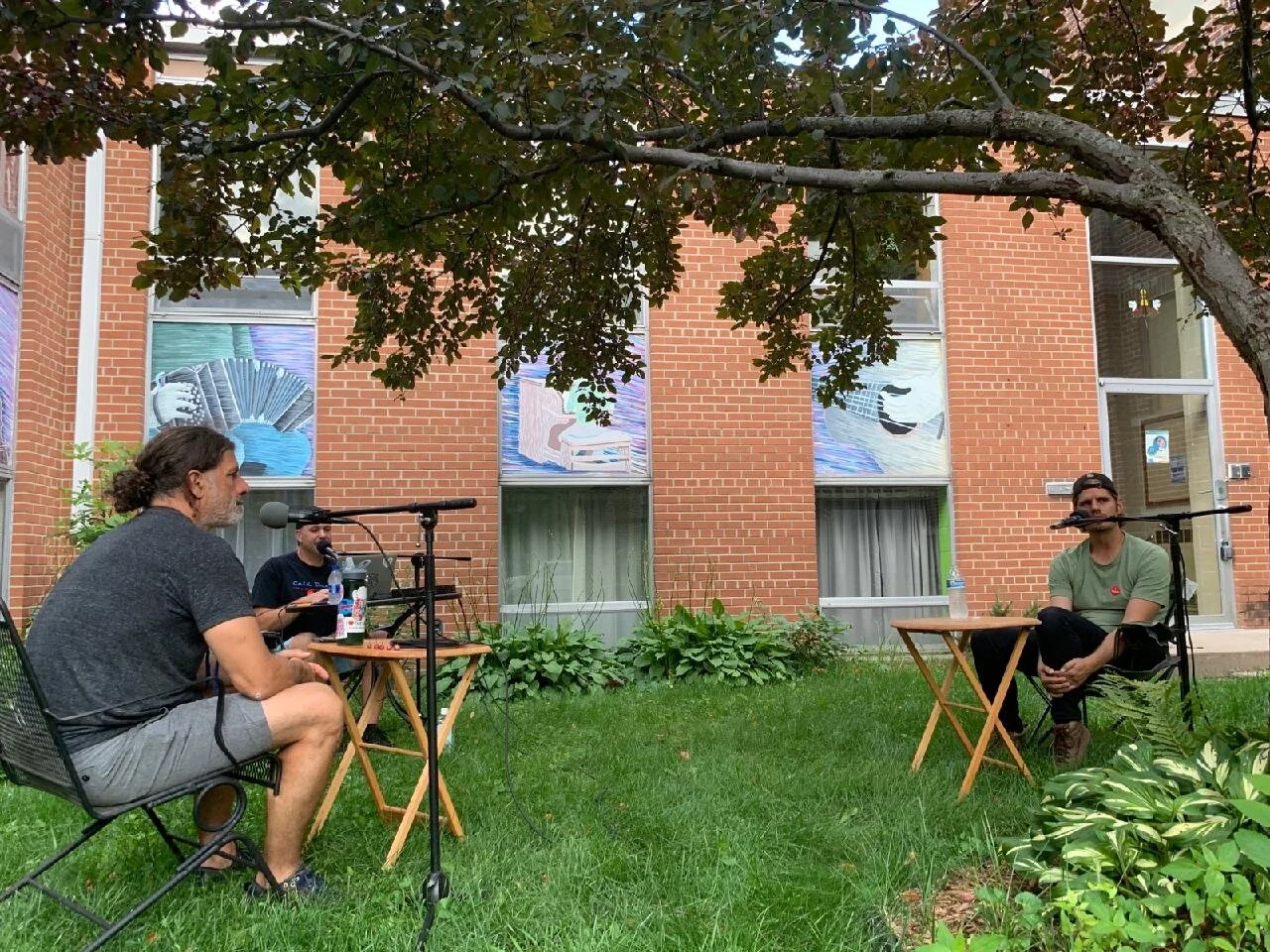 tim (middle) interviewing eddie and adam in the courtyard at the fabric minneapolis office space